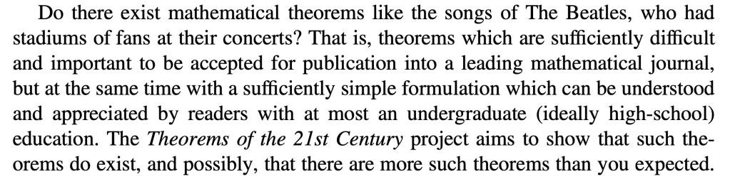 The main activity is digging into selections from Bogdan Grechuk’s book Theorems of the 21st Century. The book contains many short chapters that introduce important math breakthroughs that were published from 2001 to 2010. Each intro is 3 to 4 pages long and is written in an accessible way, showing how new math theorems grow out of familiar elementary, middle, and high school mathematics. Here is the book’s preface, table of contents, and two sample chapters. I will provide participants with a pdf copy of the book to use during the program.