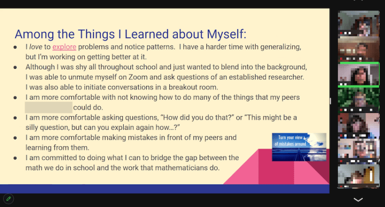 “Discussing and collaborating with other participants helped me see new perspectives on the problems. So many other participants had so many great ideas and extensions on the problems, and it opened my eyes to how I can expand on problems like these and how I can continue to discover things in math.“